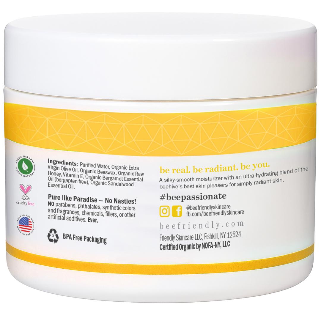 Its formula includes Purified Water, Organic Extra Virgin Olive Oil, Organic Beeswax (contains Pollen & Propolis), Organic Raw Honey, Vitamin E, Organic Bergamot Essential Oil (bergapten free), Organic Sandalwood Essential Oil. No chemicals, fillers, synthetic preservatives, dyes, or fragrances.